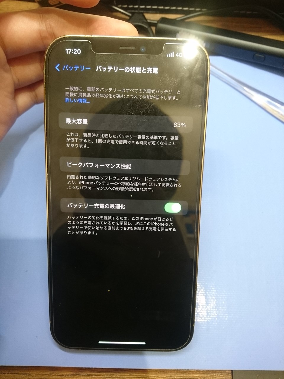 最大容量は83%です、交換の推奨値は80%±5%なのでちょうどいい時期ですね。